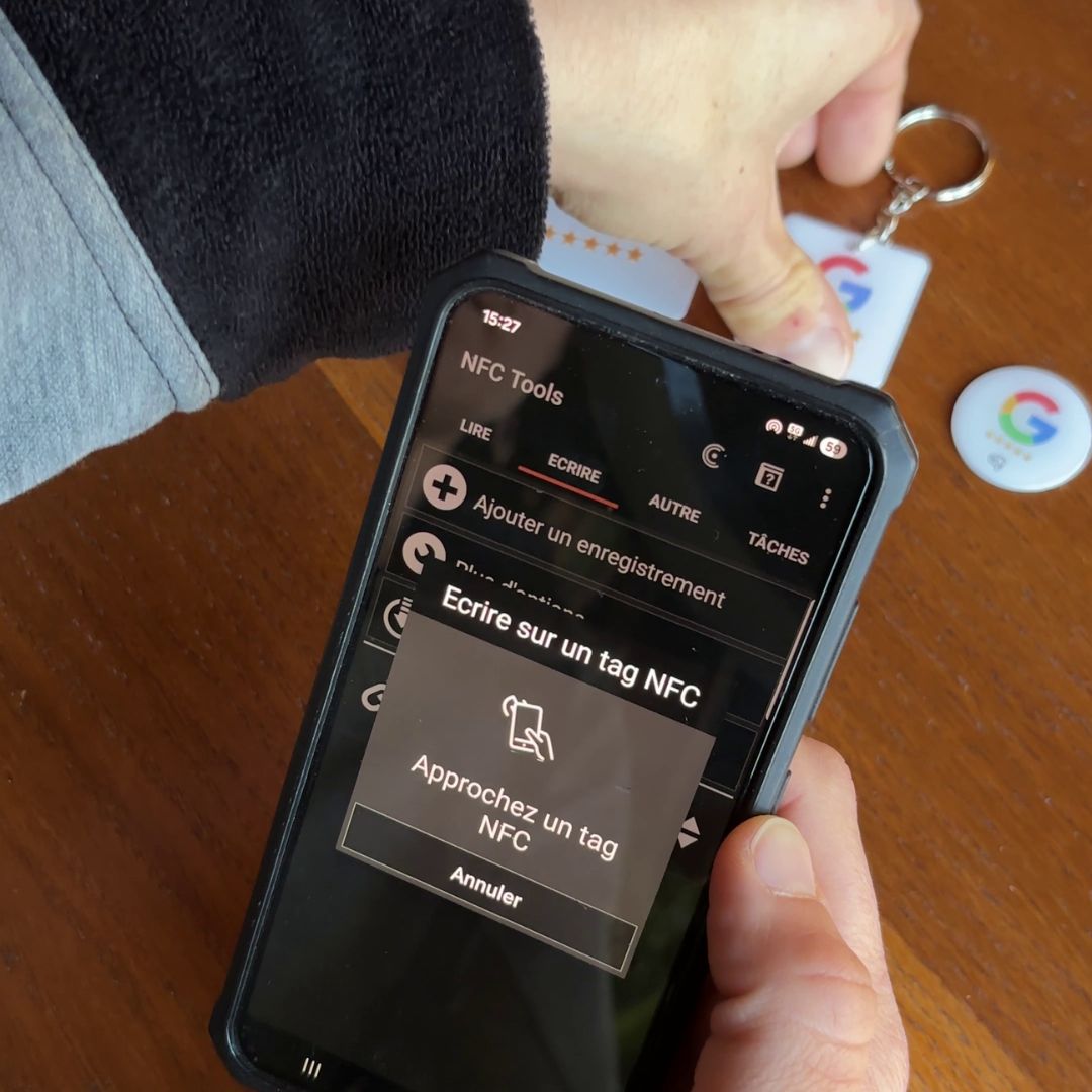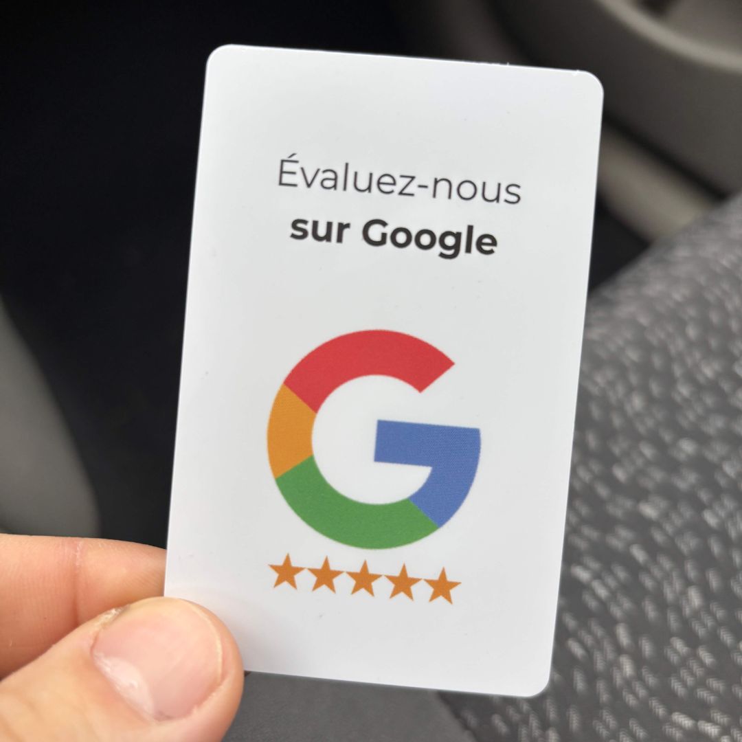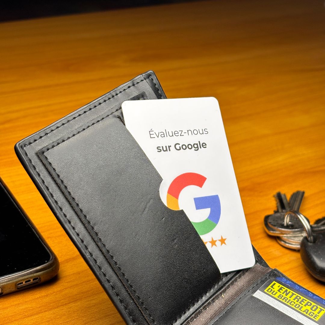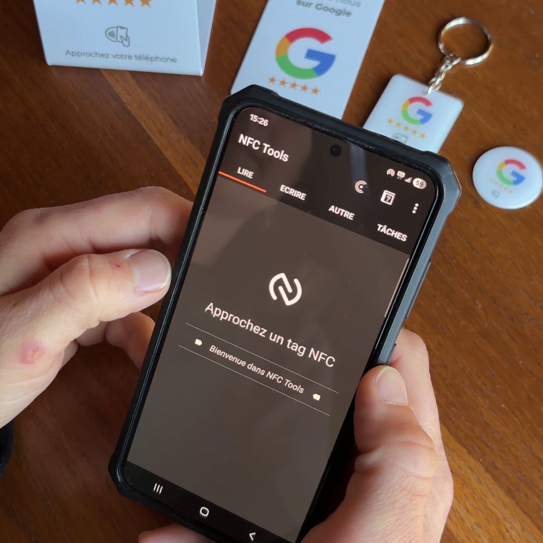 Il vous suffit d'y entrer votre lien Google business grâce à une app gratuite pour NFC (NFC Tools) et votre support est prêt à l'emploi.