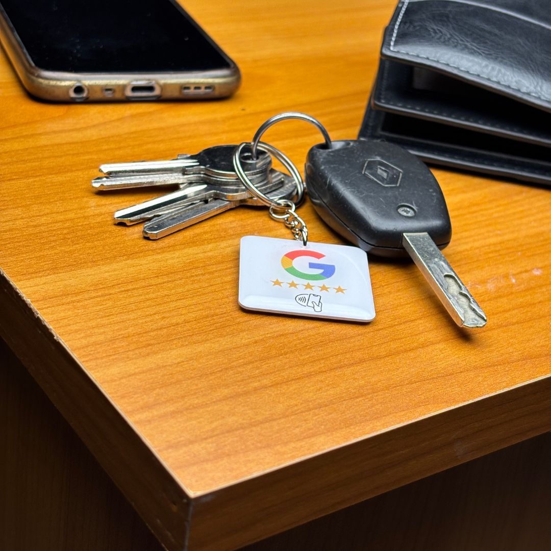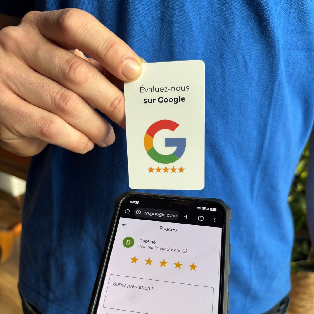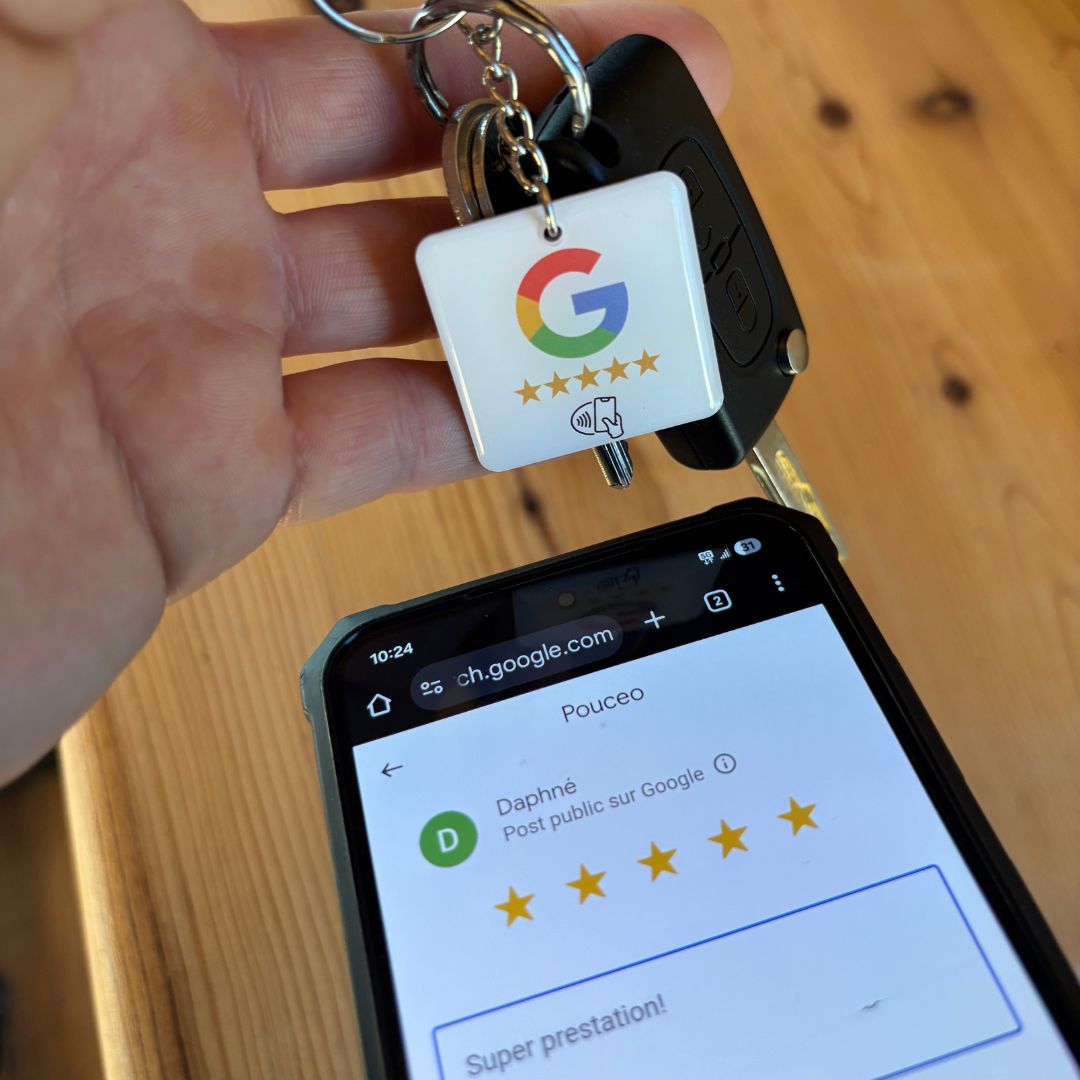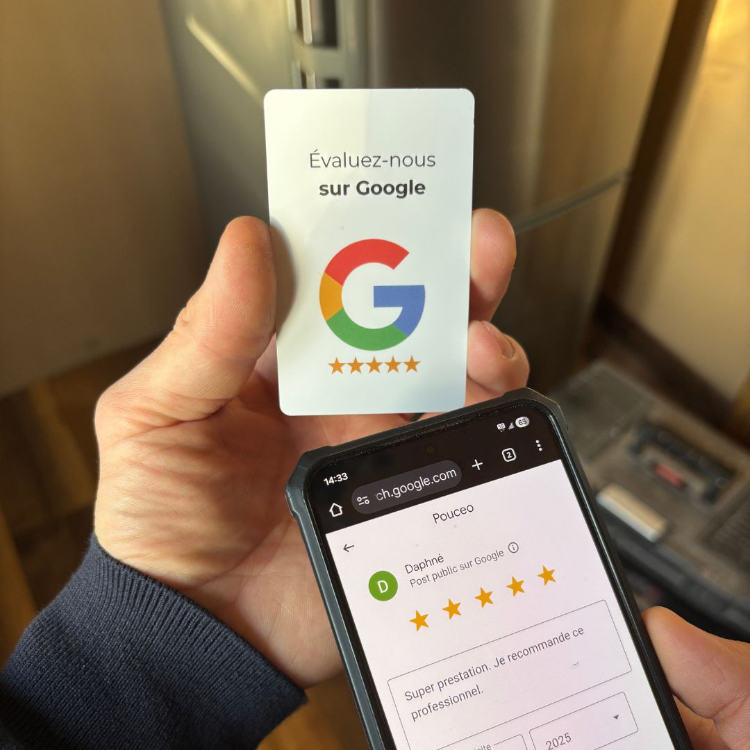 Il vous suffit d'y entrer votre lien Google business grâce à une app gratuite pour NFC (NFC Tools) et votre support est prêt à l'emploi.